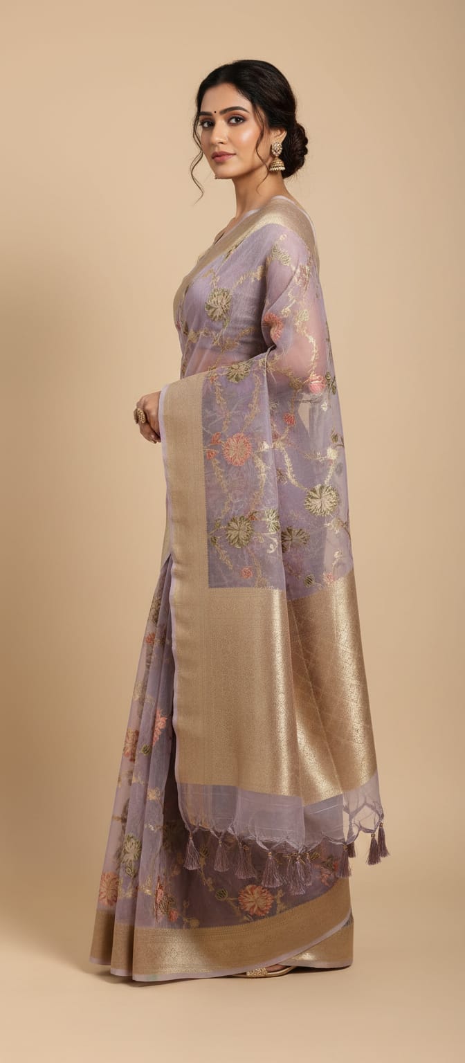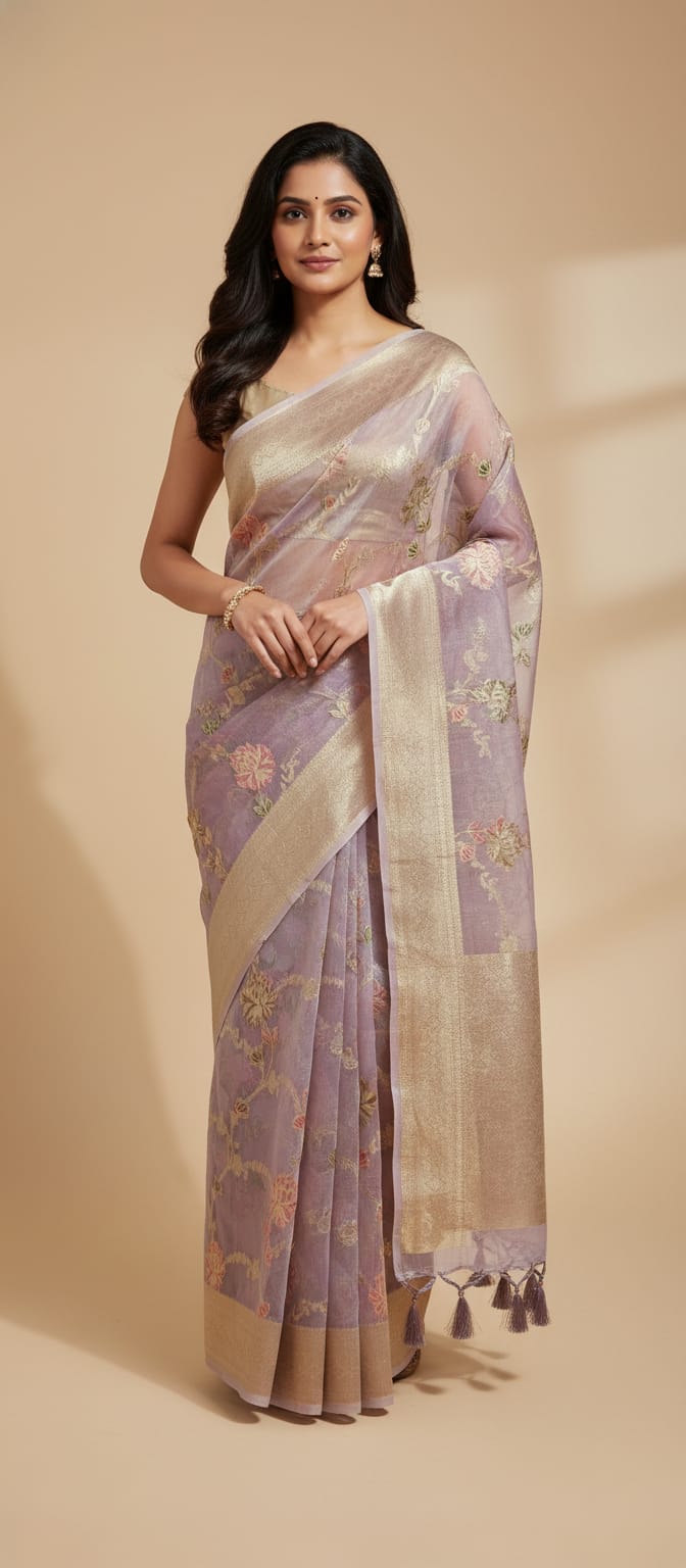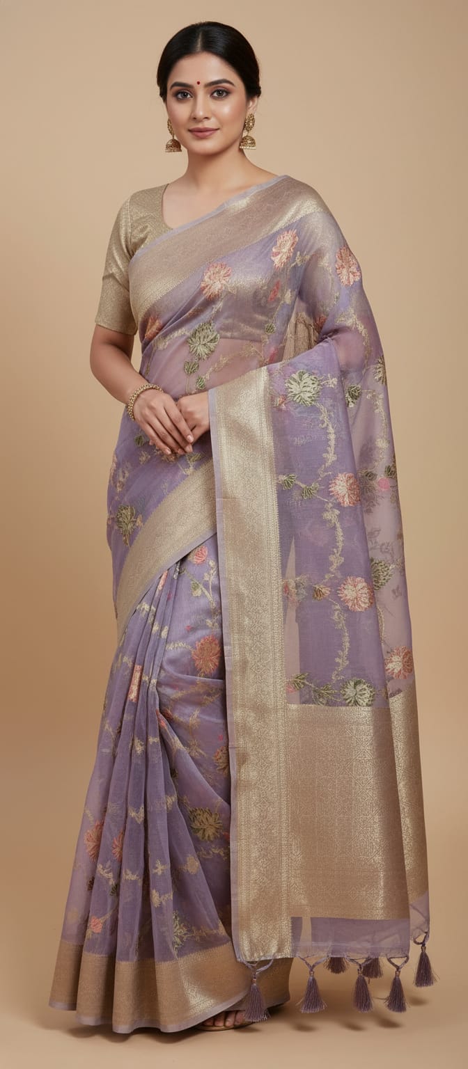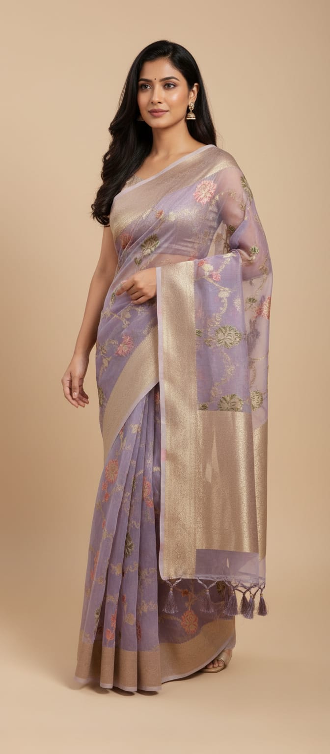 Owlsky Lavender & Gold-Toned Floral Woven Design Organza Silk Saree with Tassels