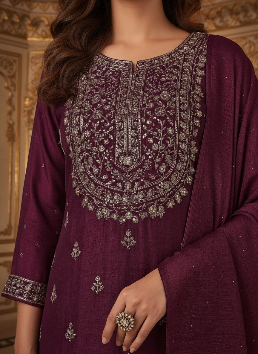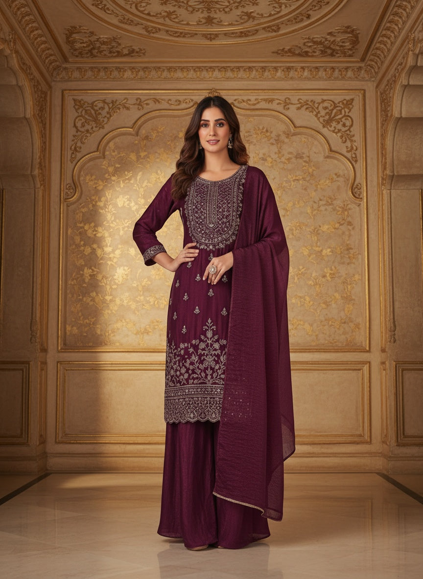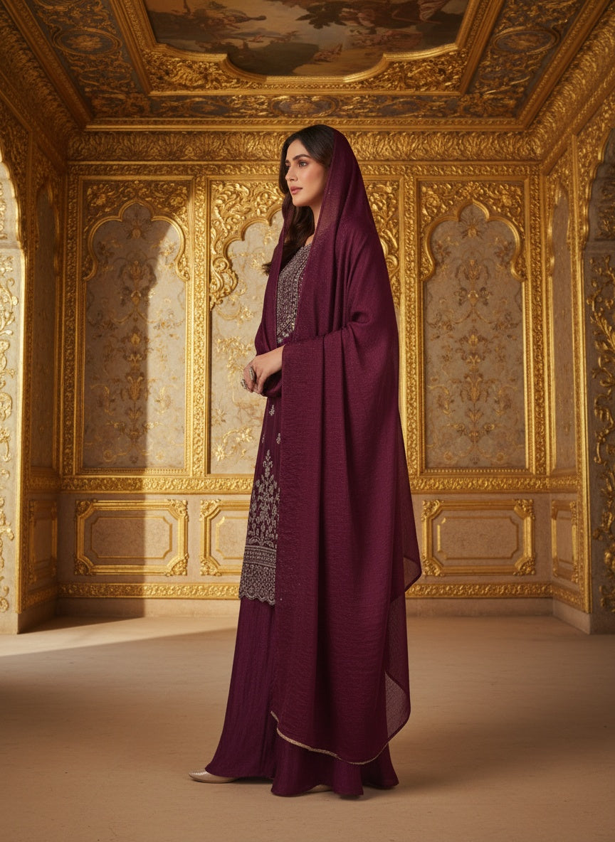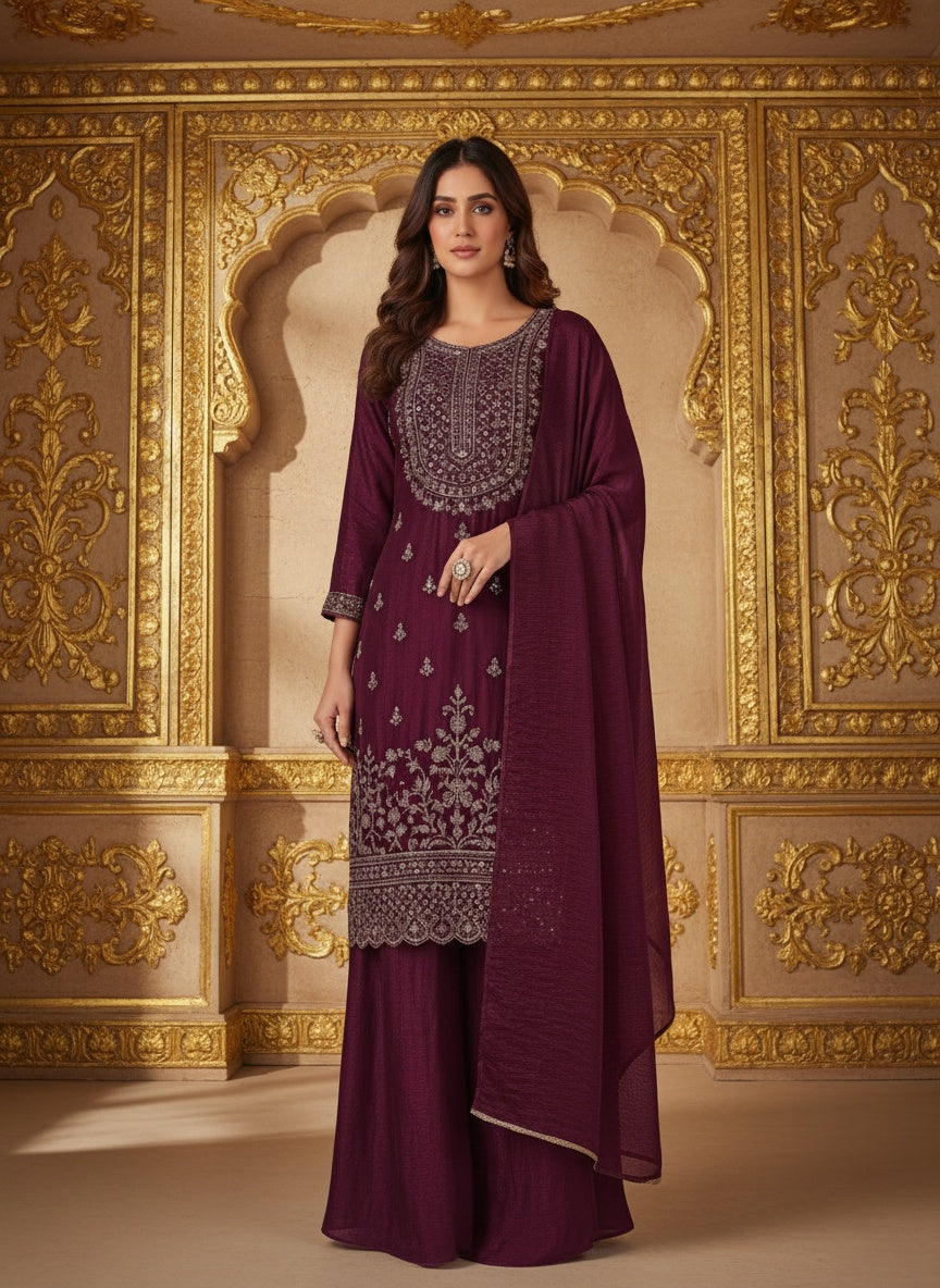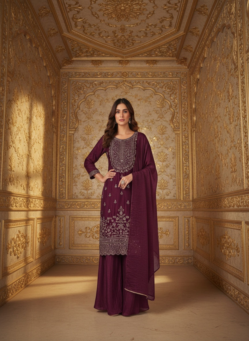 Women’s Wine Purple Embroidered Kurta Sharara Set with Dupatta | Designer Festive & Wedding Ethnic Wear for Women