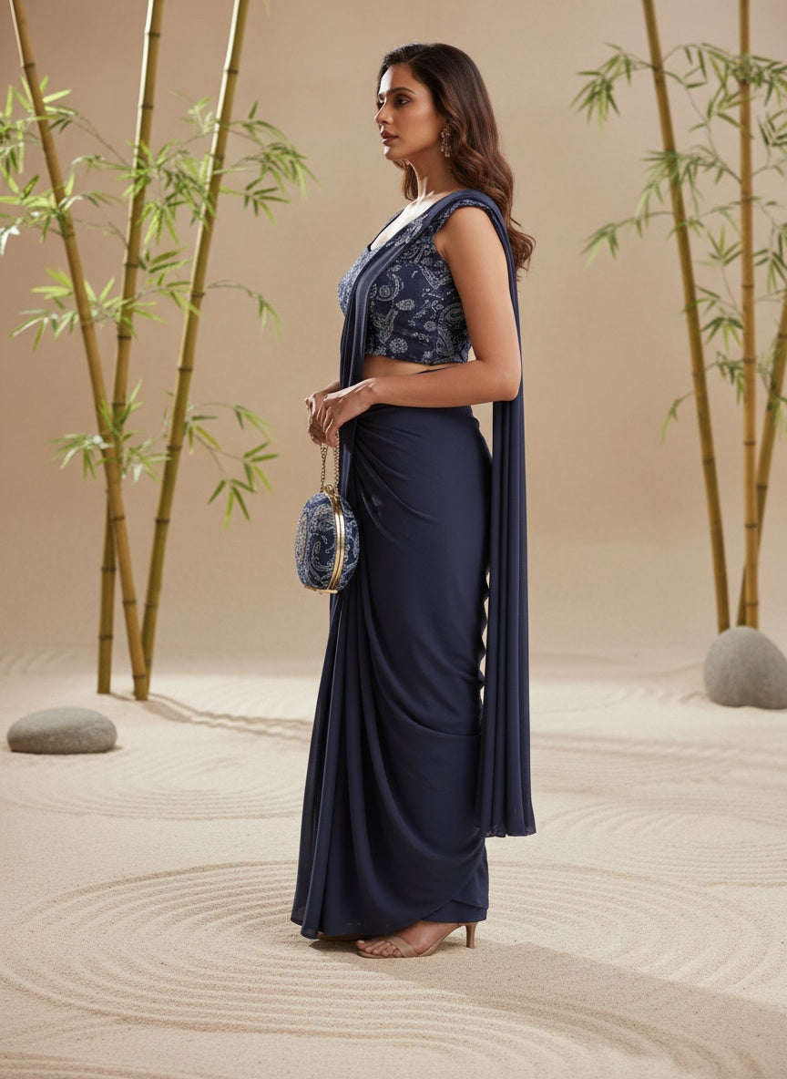 Women Navy Blue Ready-to-Wear One Minute Saree with Embroidered Sleeveless Blouse | Premium Lycra Party,Wedding & Festive