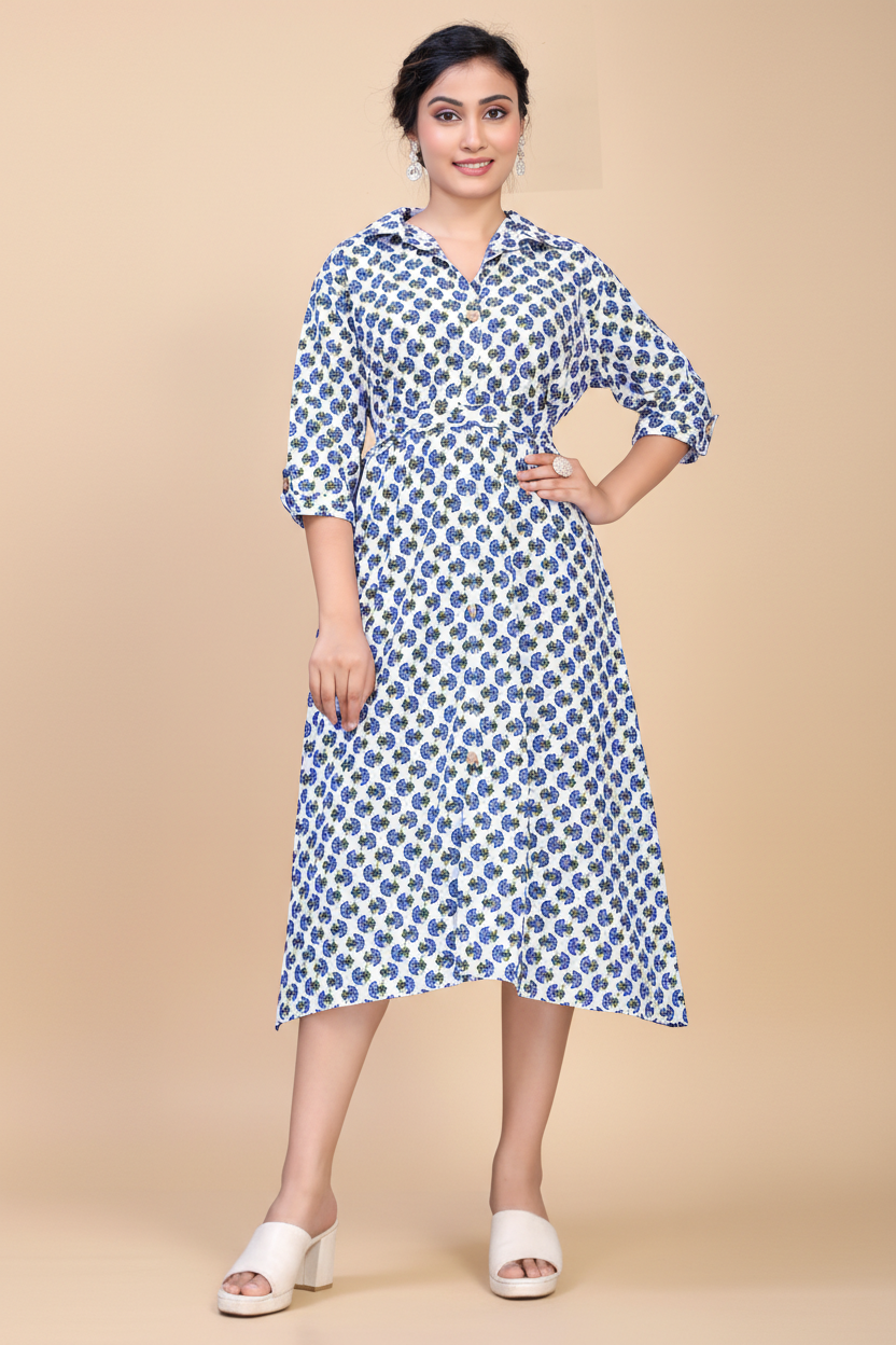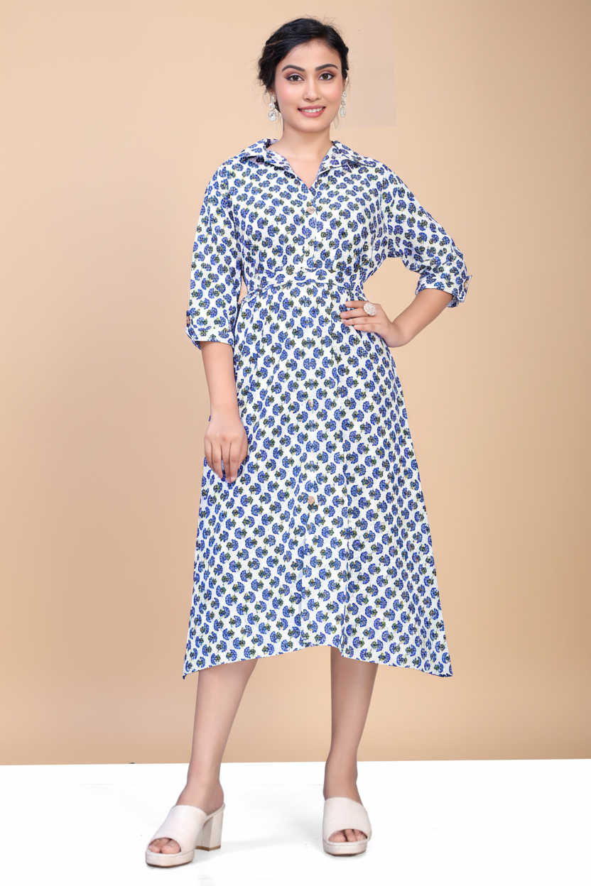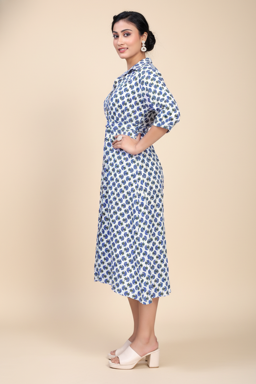 Owlsky Women Blue & White Floral Printed Pure Cotton A-Line Shirt Dress One Piece