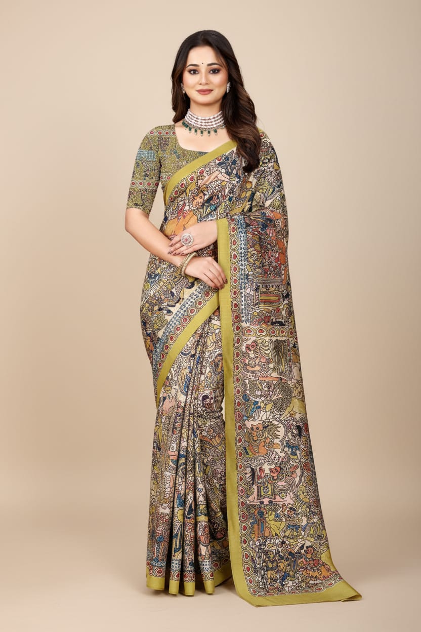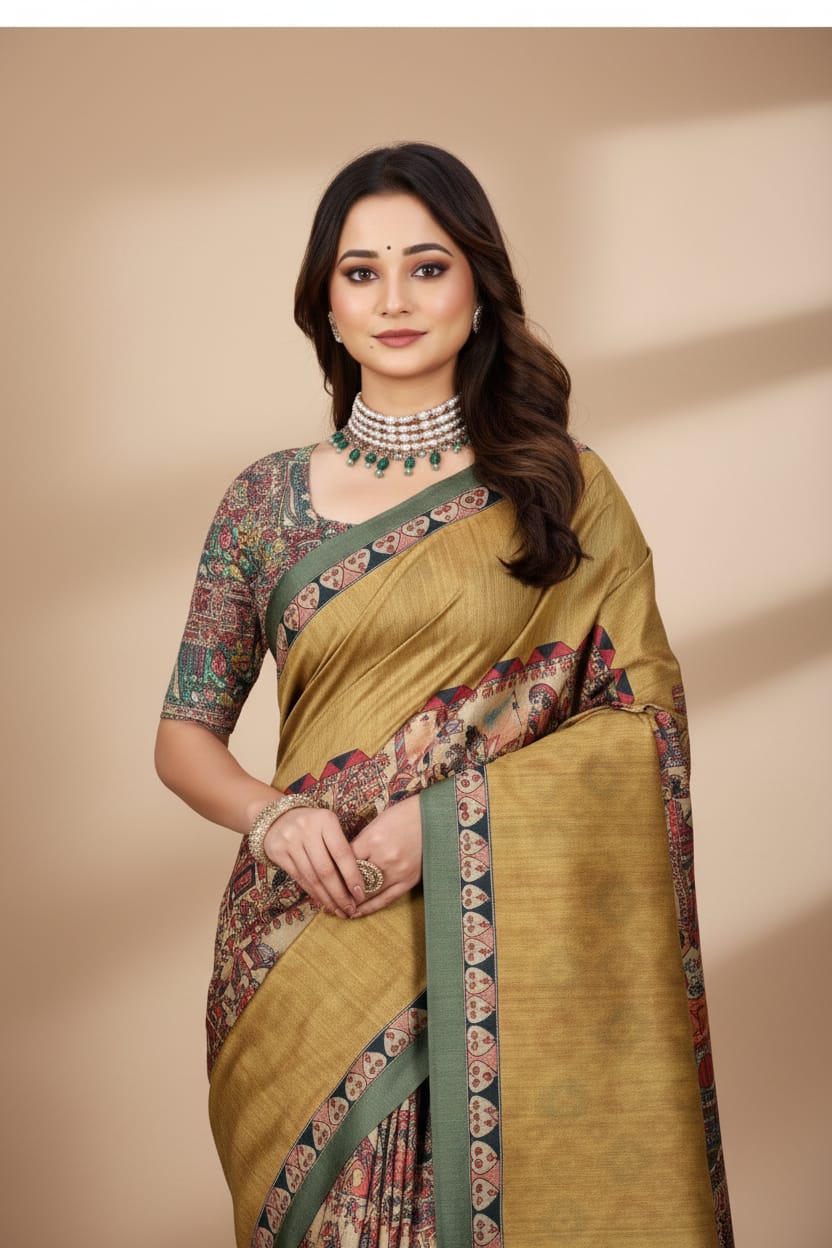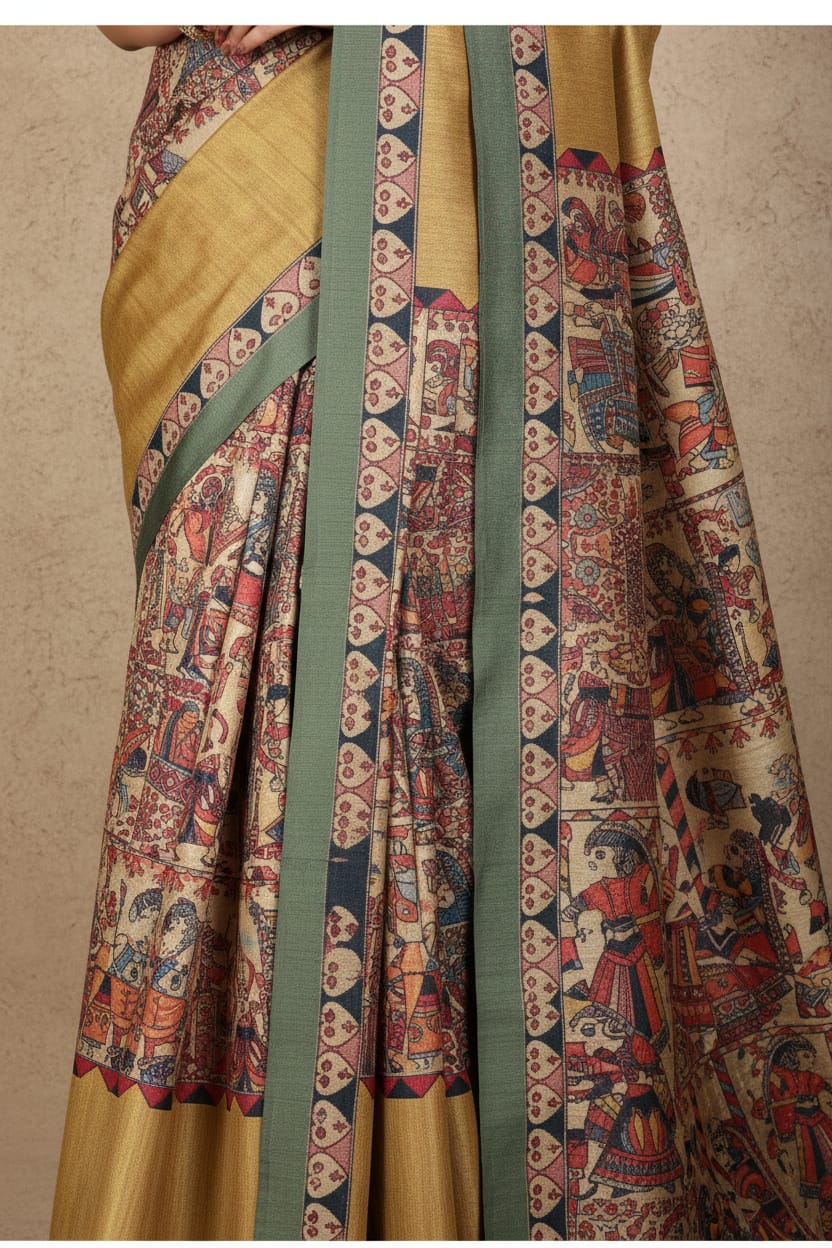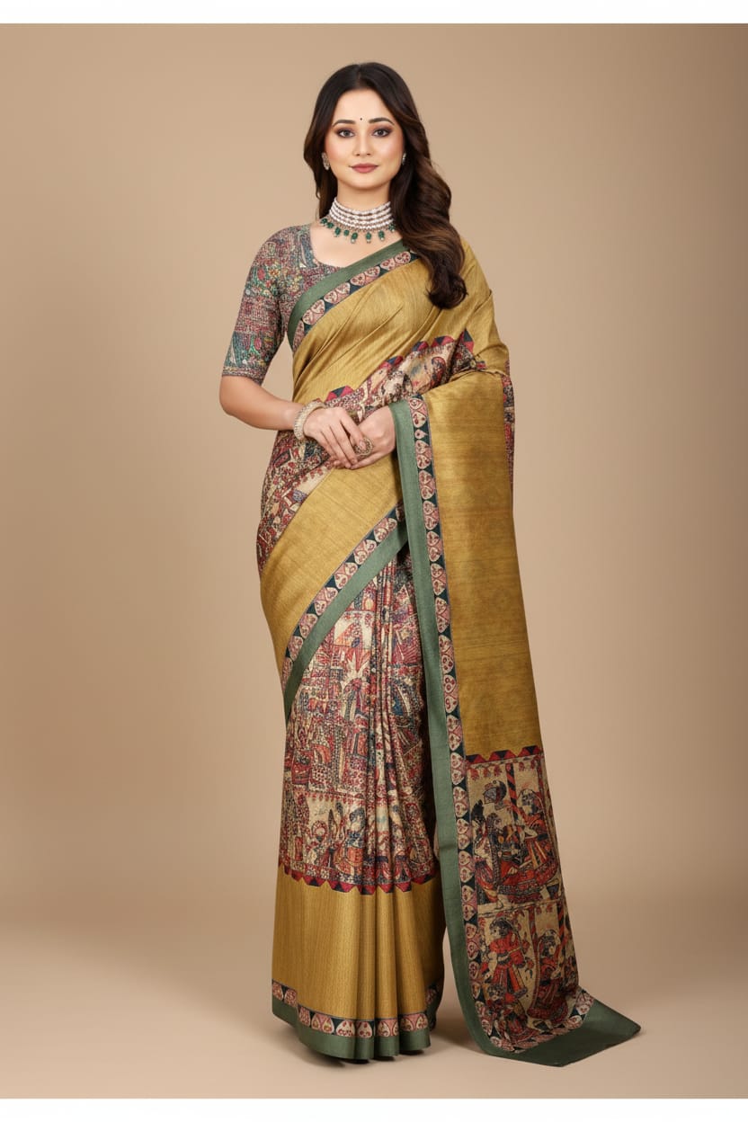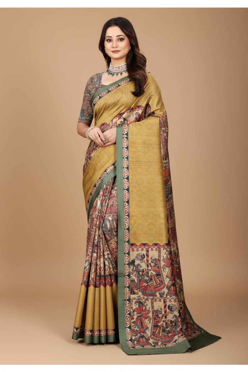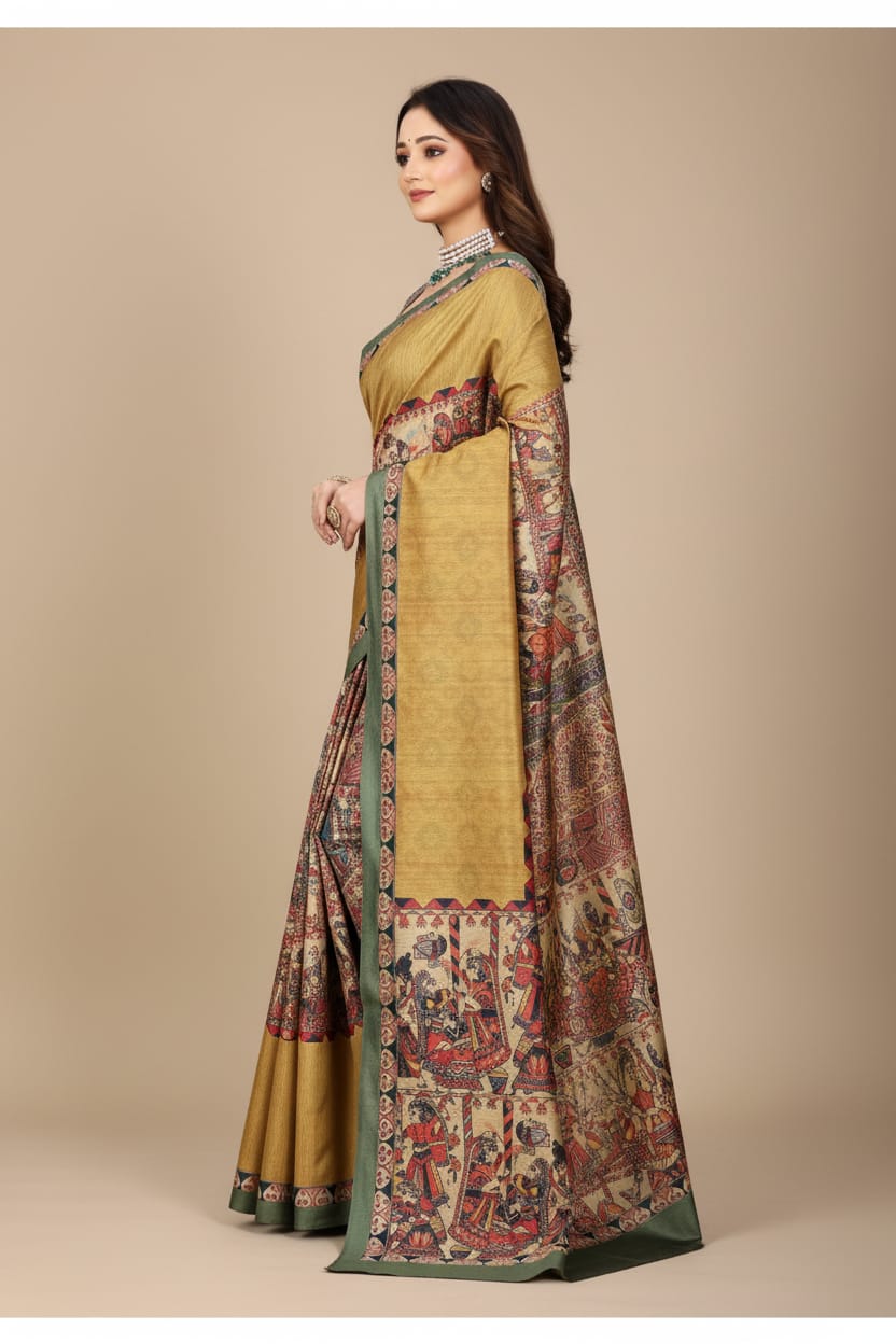 Madhubani Print Manipuri Silk Saree for Women | Indian Ethnic Party & Casual Wear | Unstitched Blouse Included-Musturd Yellow
