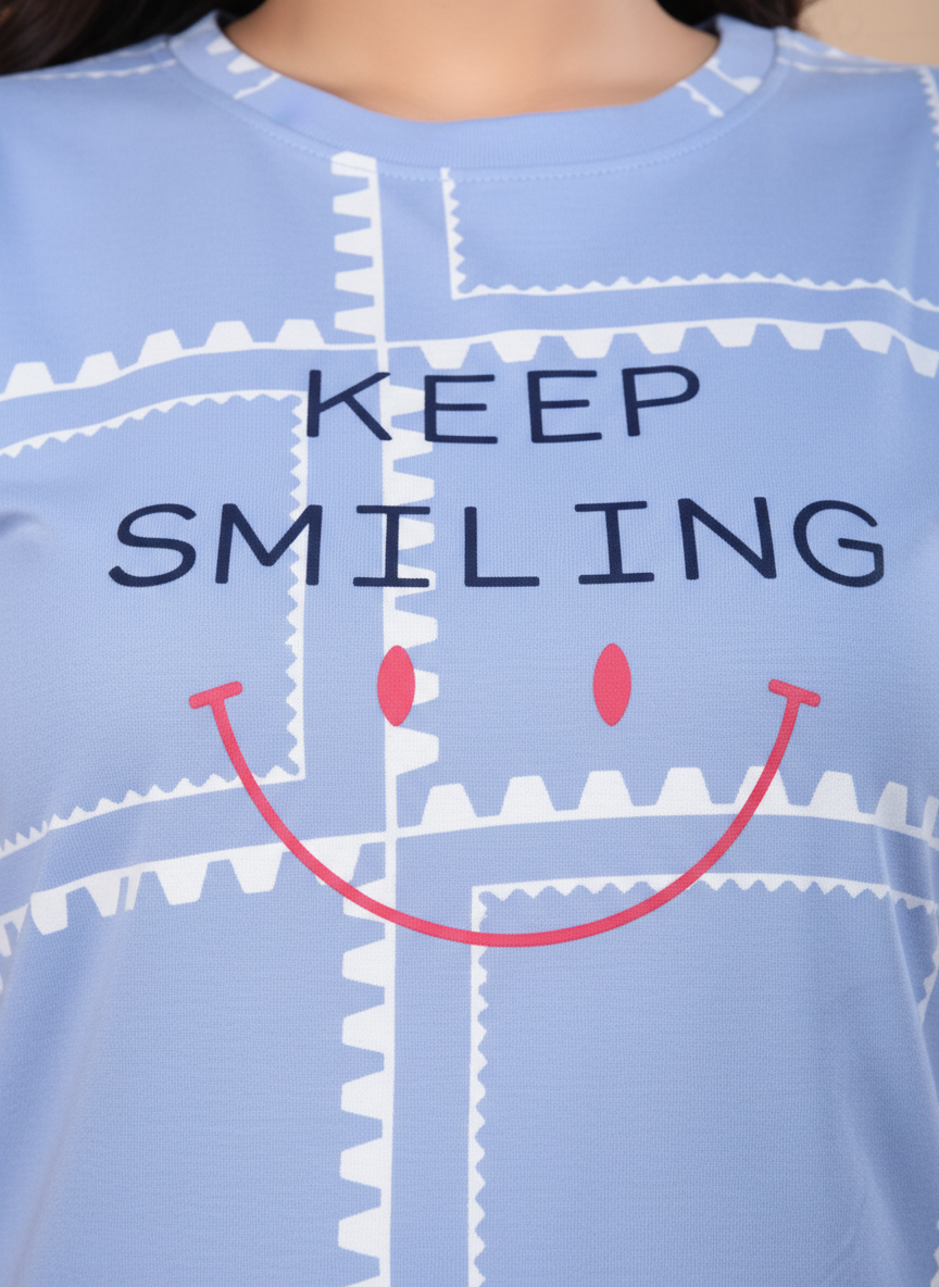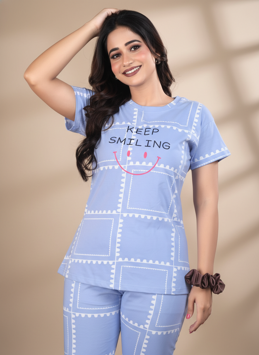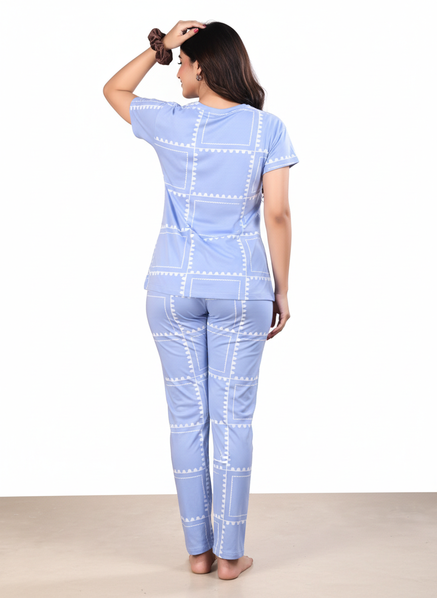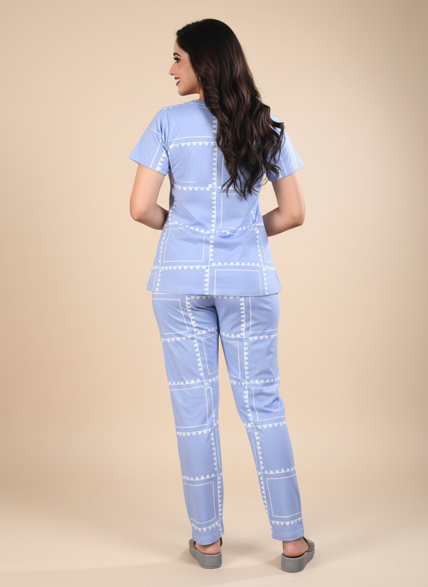Owlsky Women Sky Blue & Navy Printed Hosiery Cotton Nightsuit