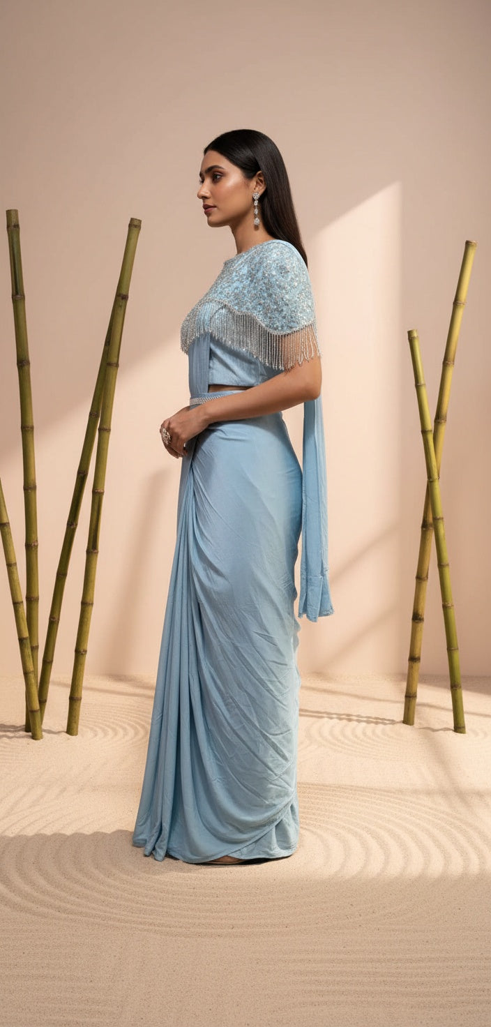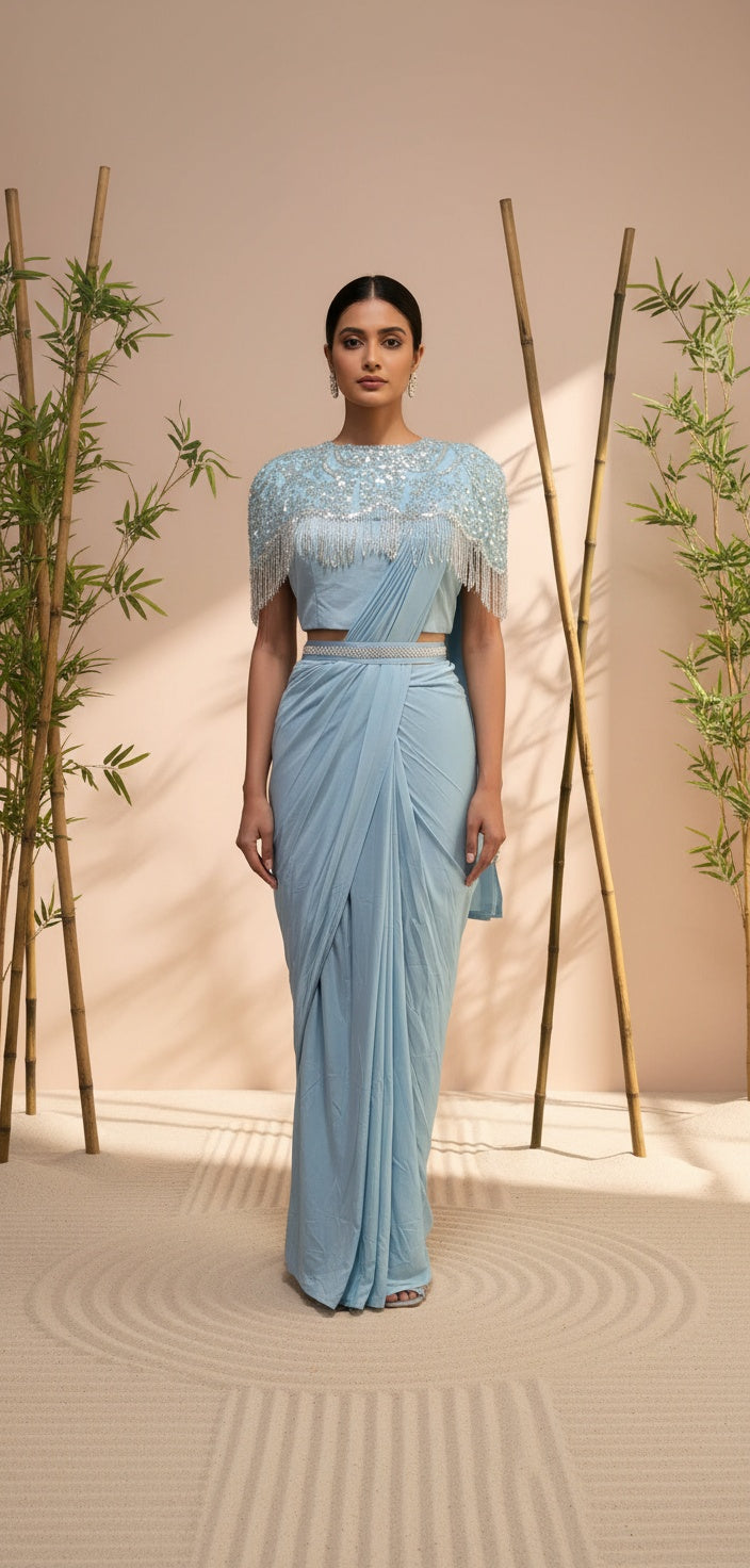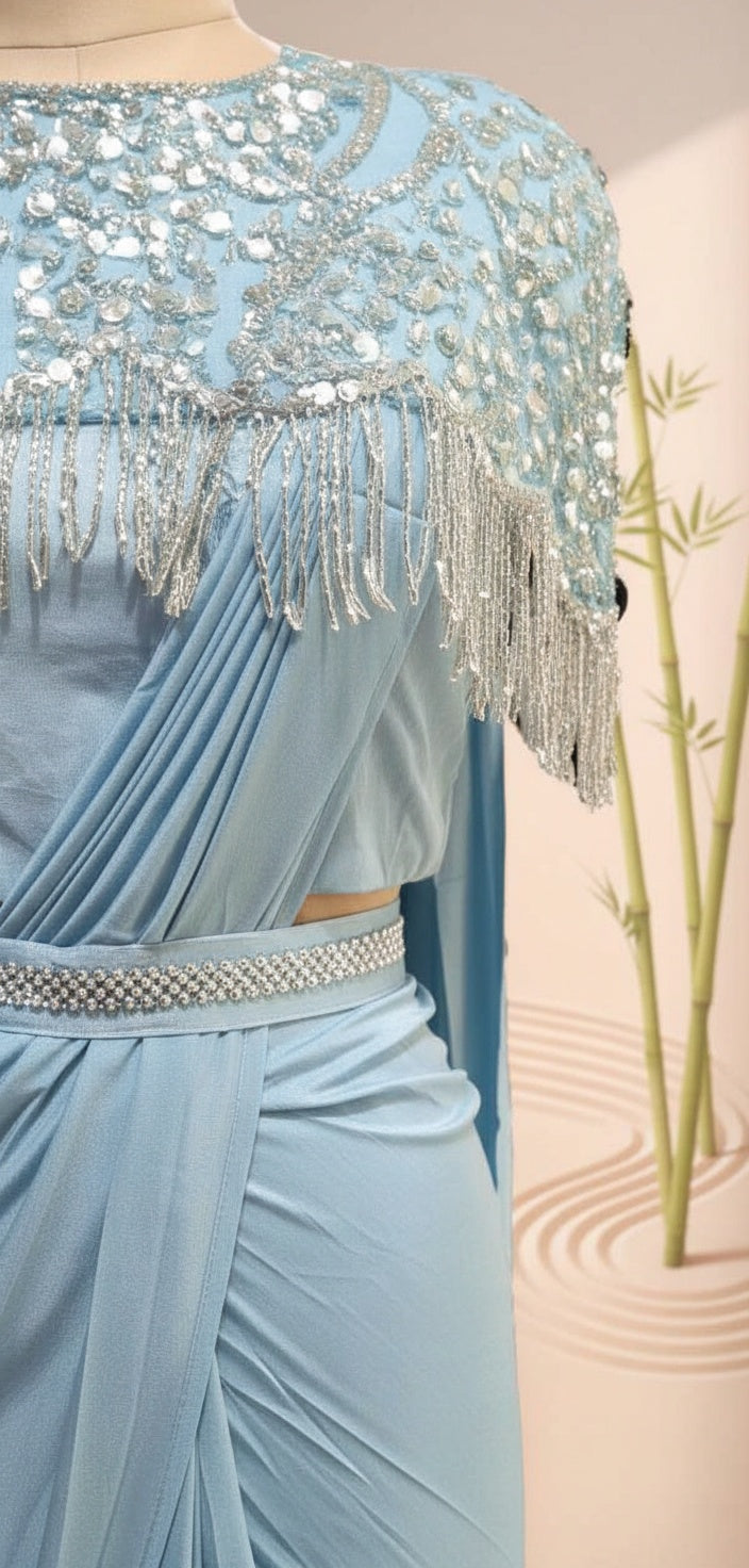 Women Sky Blue Ready-to-Wear One Minute Saree with Embellished Fringed Cape Blouse & Handcrafted Belt | Imported Georgette Wedding & Festive Saree | Pre-Draped Saree