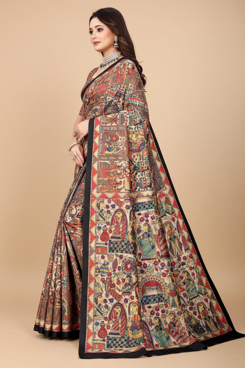 Madhubani Print Manipuri Silk Saree for Women | Indian Ethnic Party & Casual Wear | Unstitched Blouse Included - Black Border