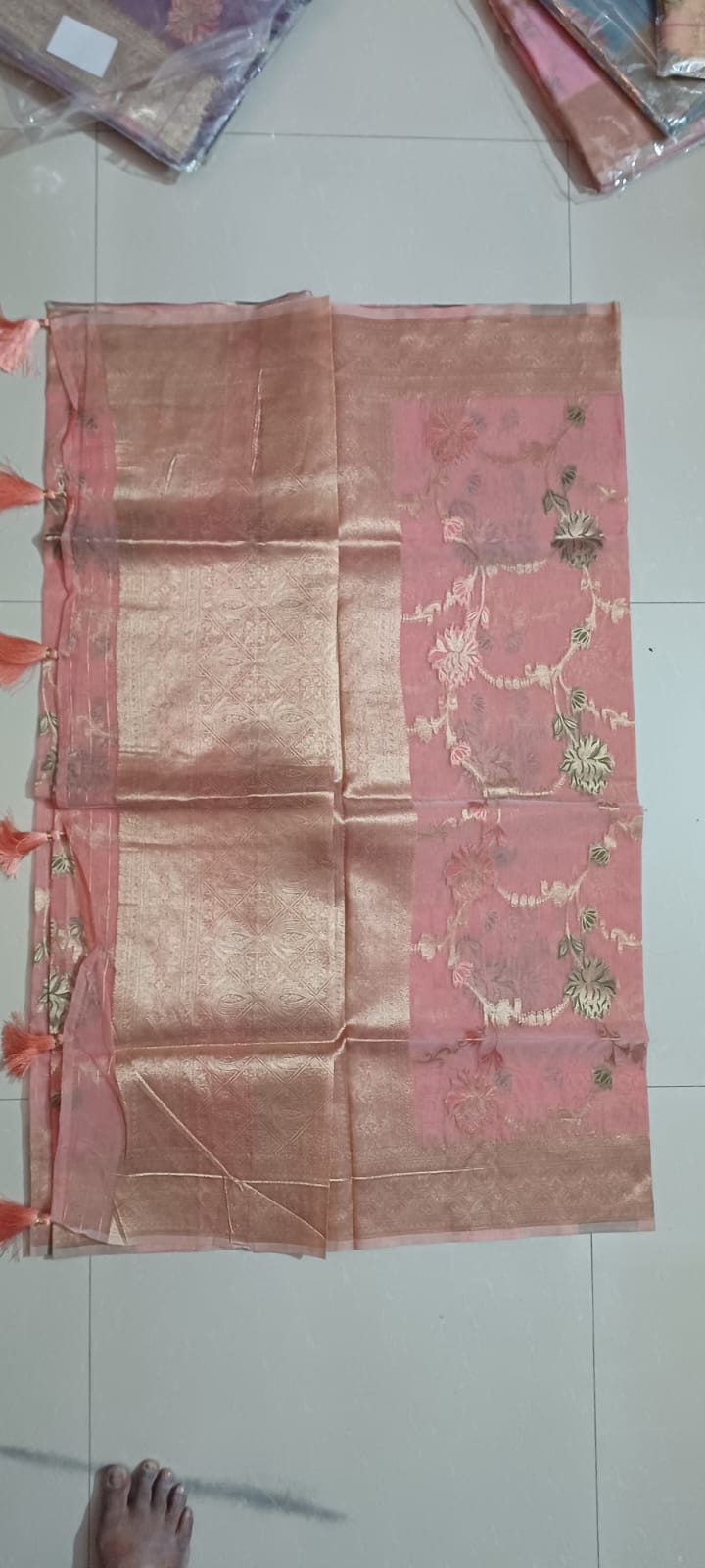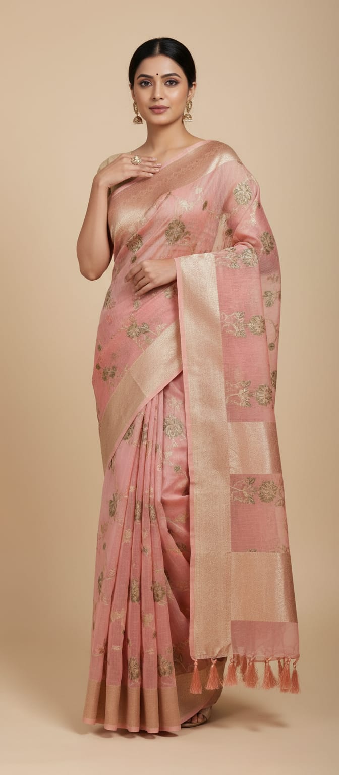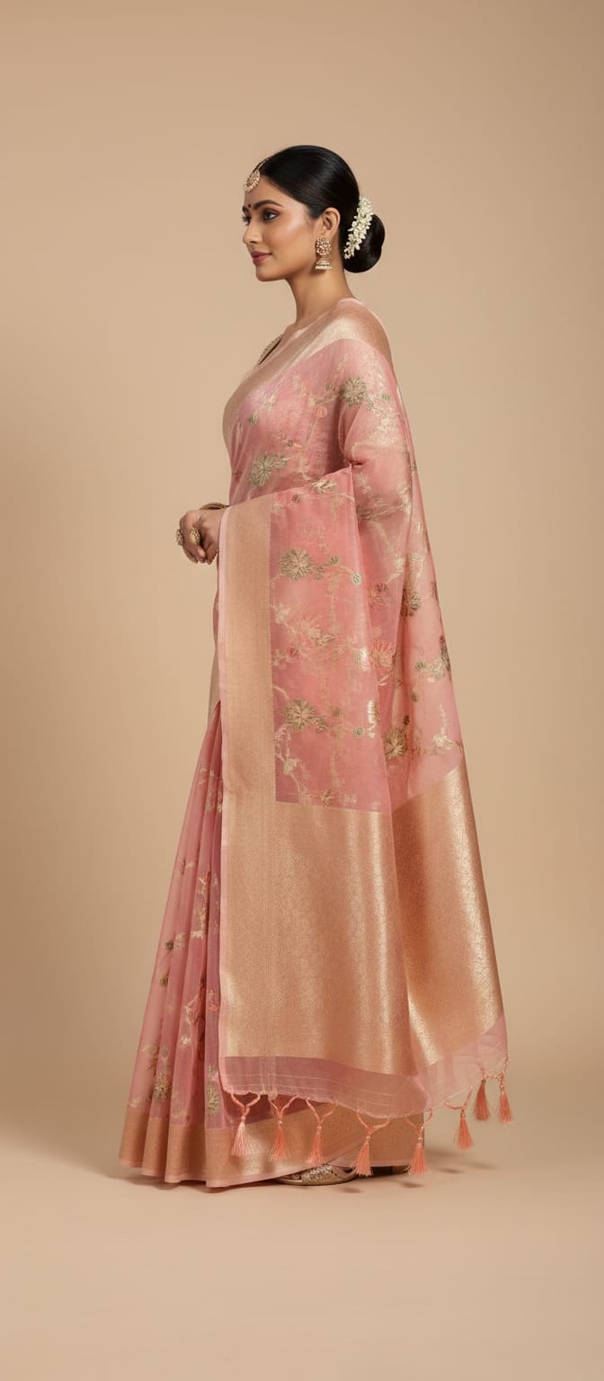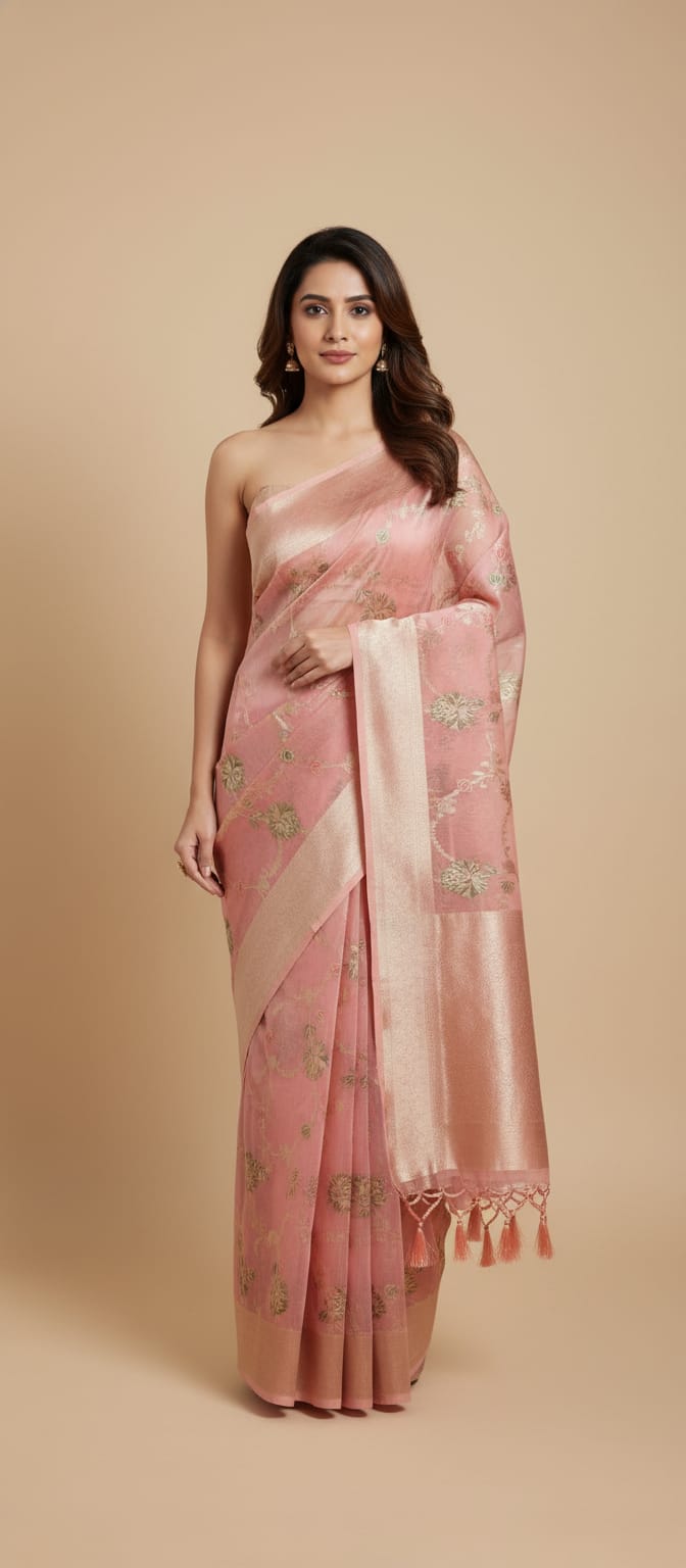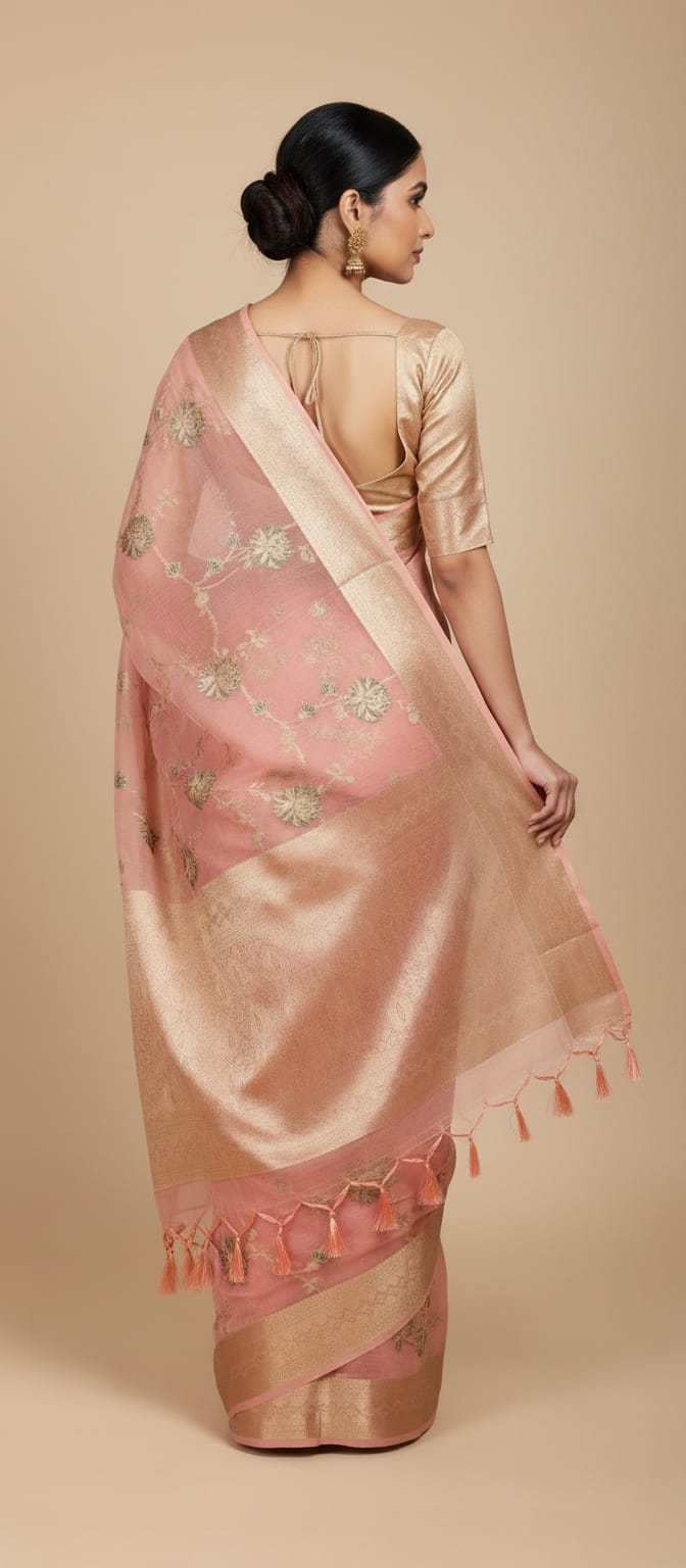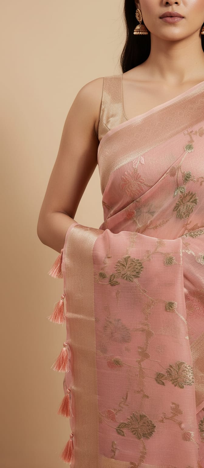 Women Pink Floral Weaving Organza Silk Saree with Woven Zari Border & Tassels