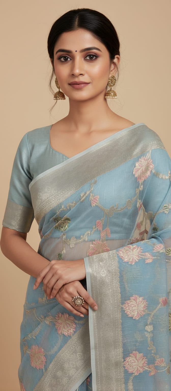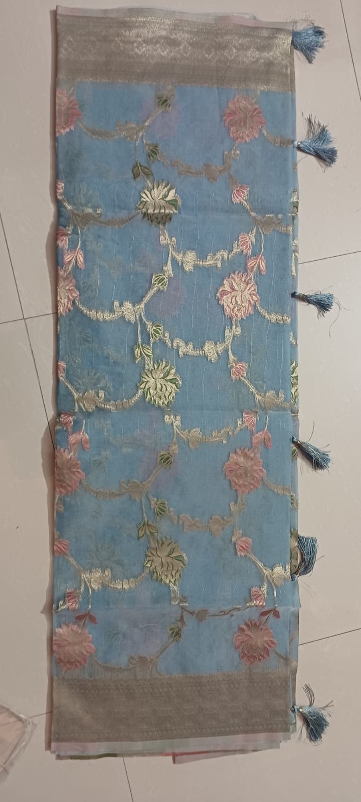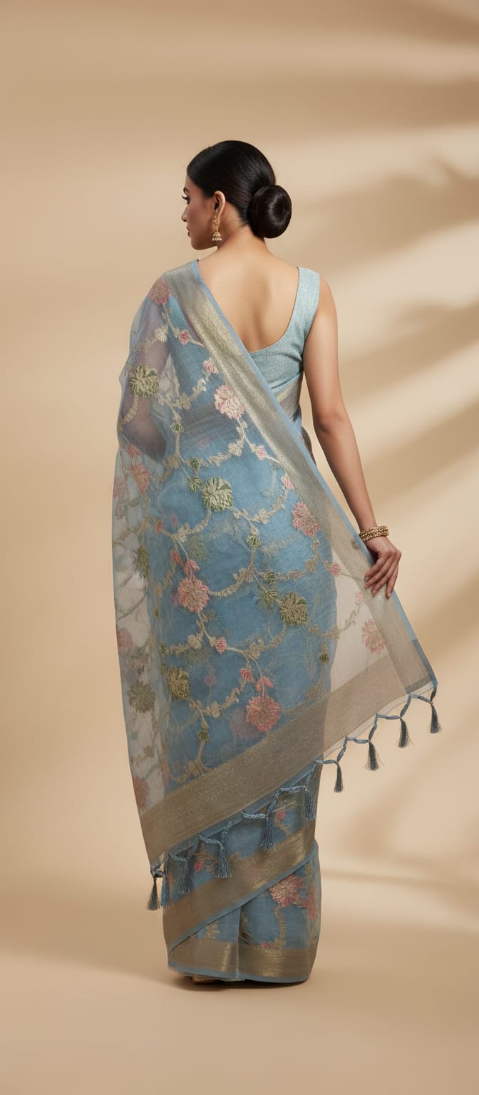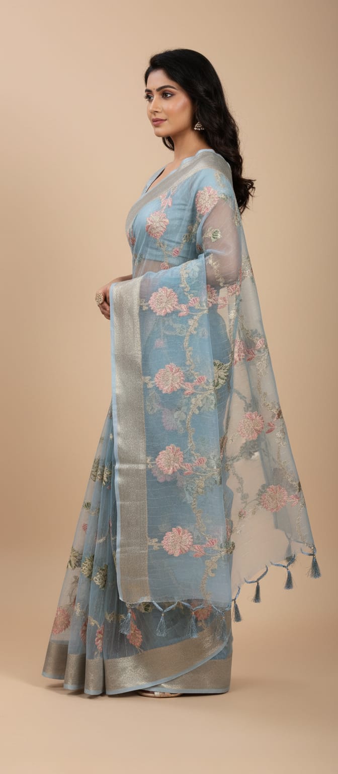 Owlsky Women Blue & Silver-Toned Floral Woven Design Organza Silk Saree with Tassels
