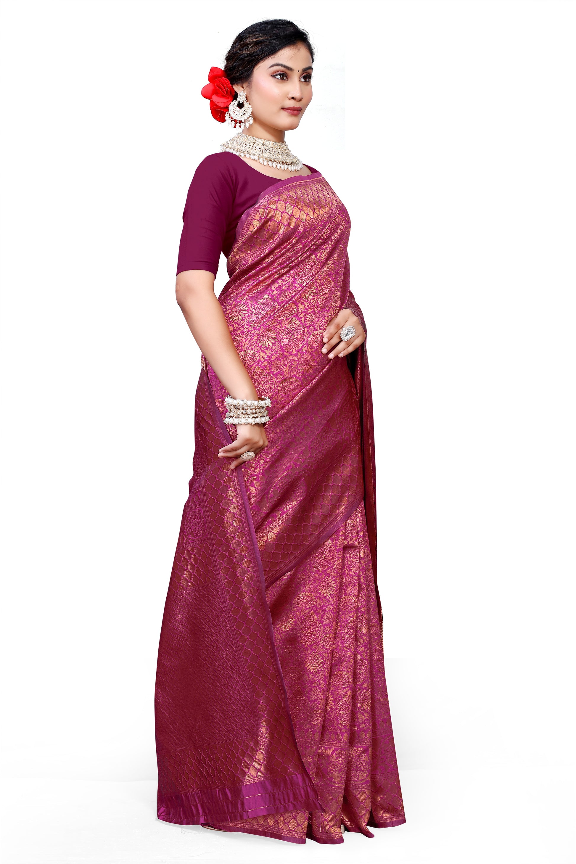 Owl Sky Kanjivaram Cotton Silk Saree for Women with Zari Border | Traditional Indian Saree with Unstitched Blouse Piece | Lightweight Festival Wear Saree | Elegant Soft Cotton Silk Saree Magenta