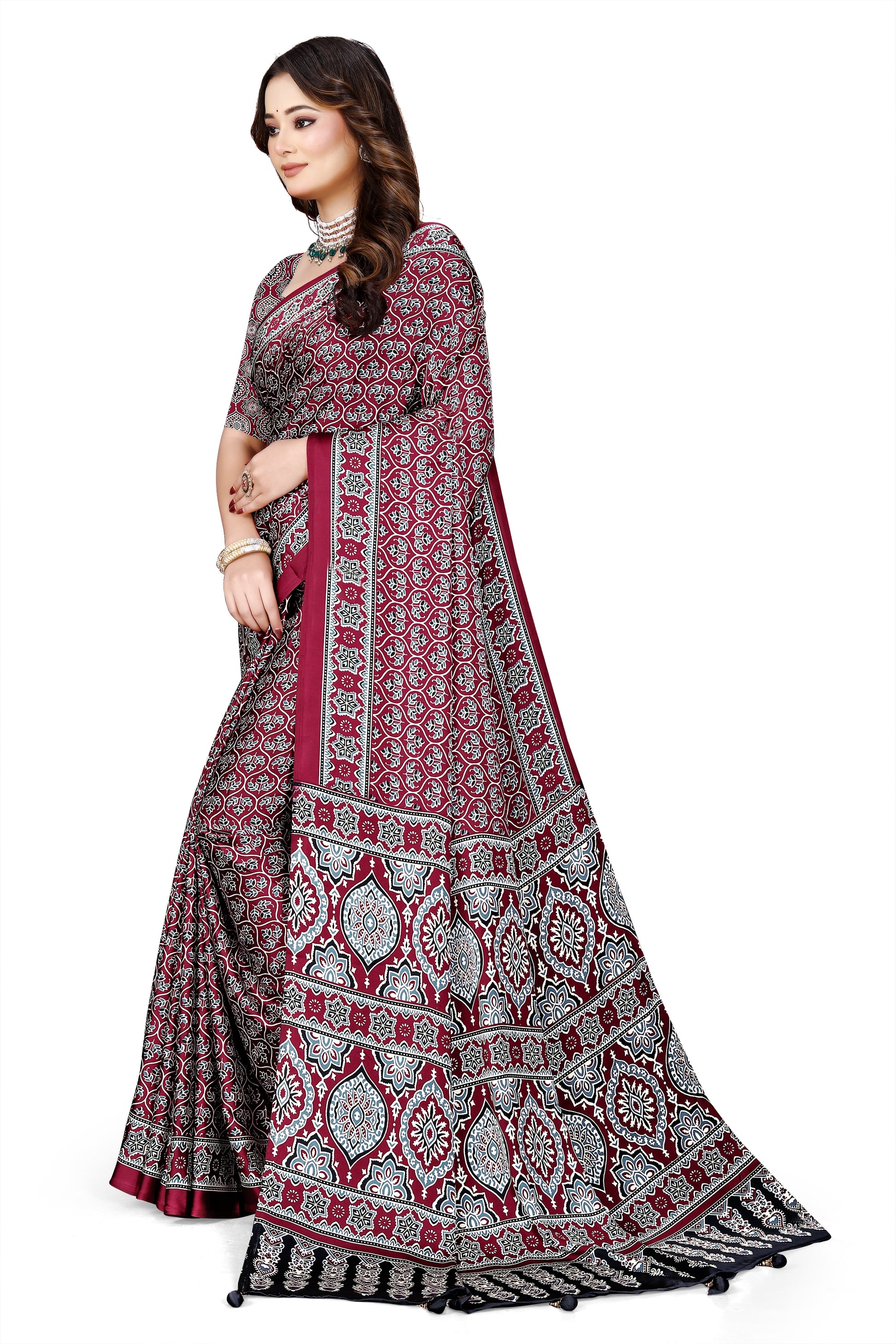 OWLSKY, SASSY & STYLO Womens Japan Satin Saree with Foil Print | Traditional Printed Saree with Unstitched Blouse | Festive Wear Saree for Women | Ethnic Designer Saree Maroon