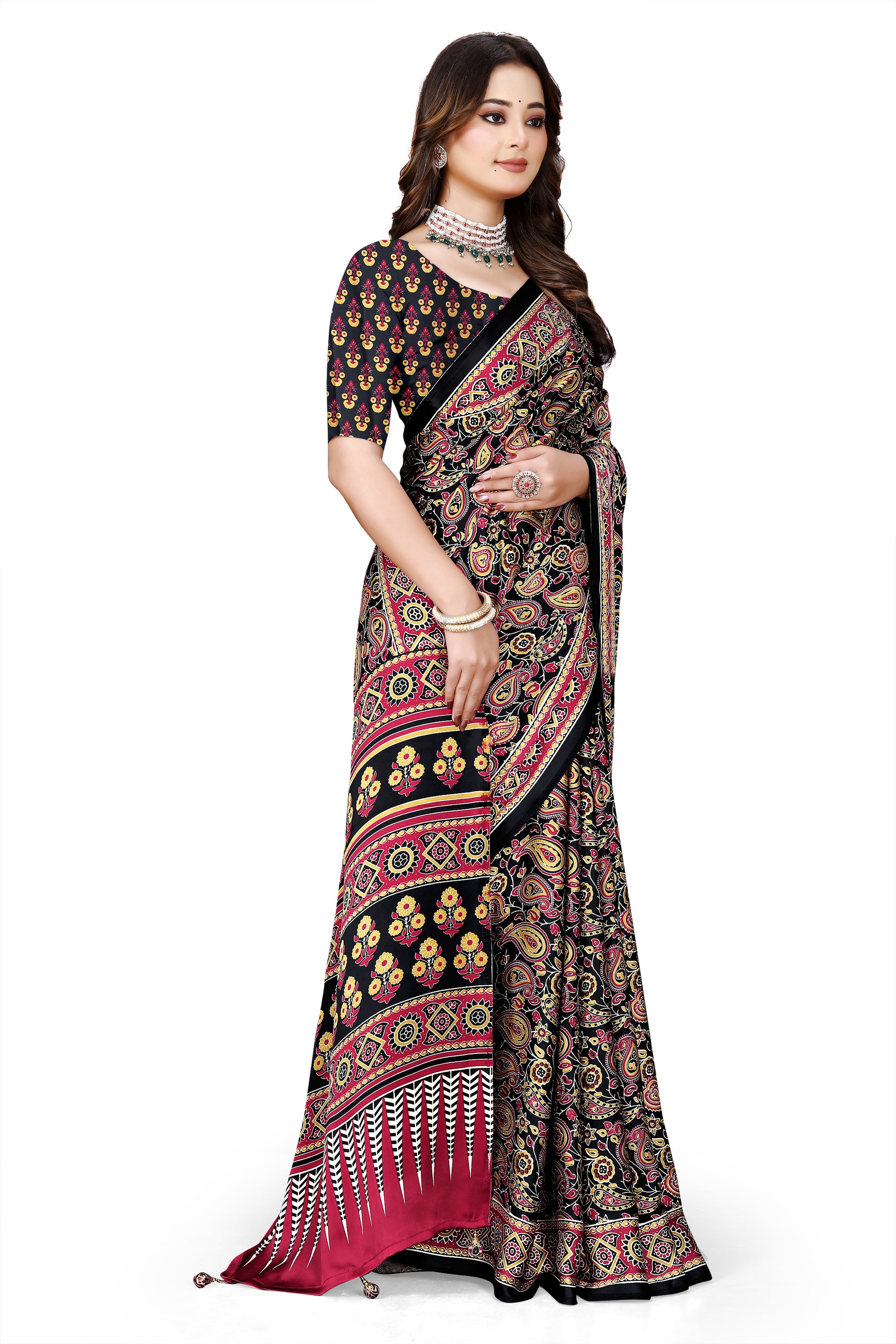 OWLSKY, SASSY & STYLO Womens Japan Satin Saree with Foil Print | Traditional Printed Saree with Unstitched Blouse | Festive Wear Saree for Women | Ethnic Designer Saree Brown