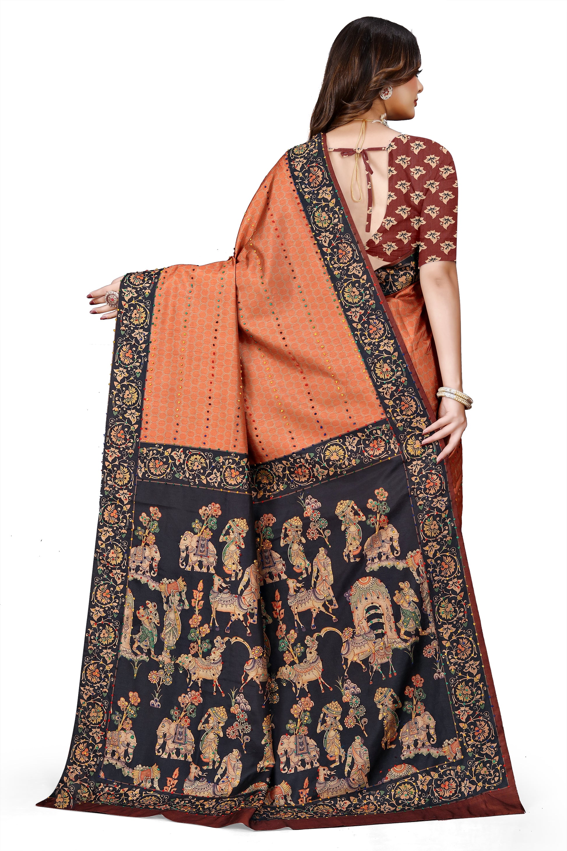 OWLSKY, SASSY & STYLO Women's Trendy Blended Silk Saree with Kalamkari Pallu & Designer Border | Festive Traditional Saree for Women | Traditional floral Motif | Saree With Unstiched Blouse Rust Orange